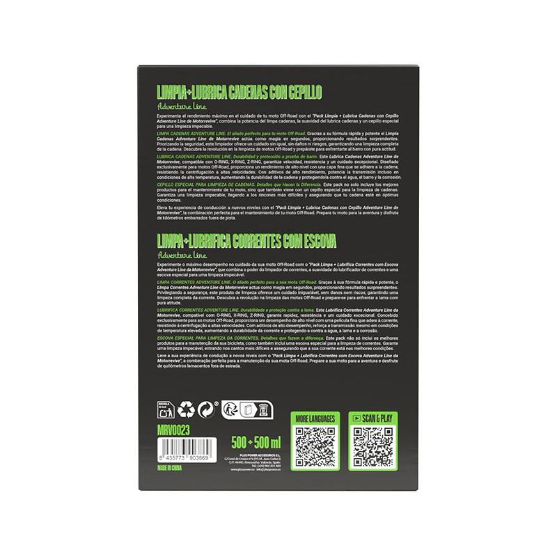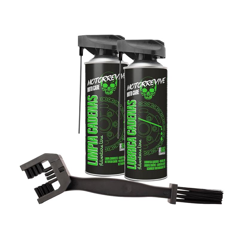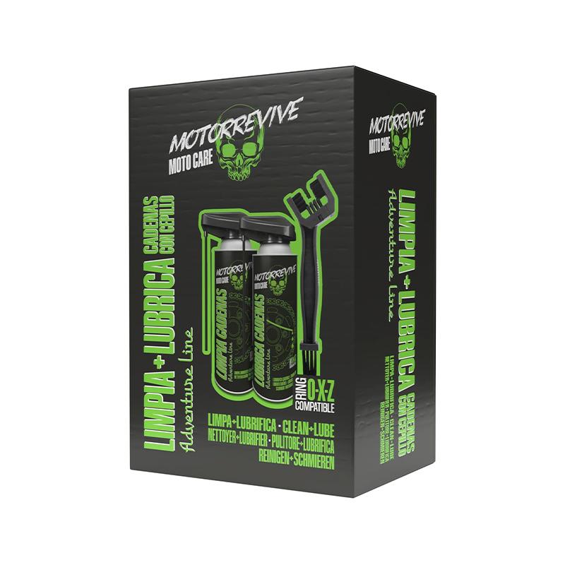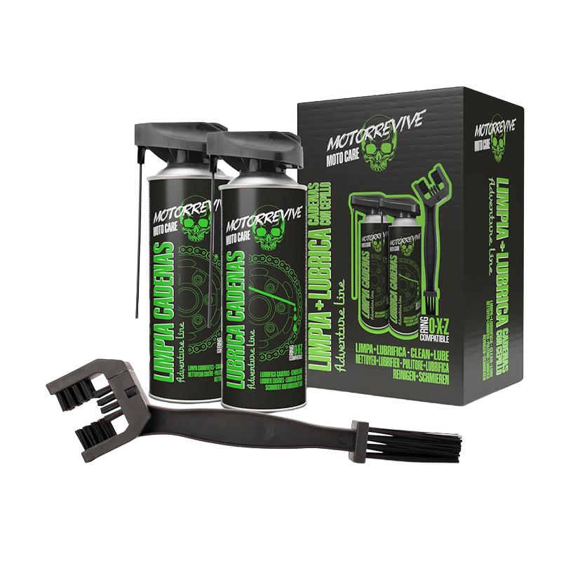 El Pack Adventure Line de Motorrevive está diseñado para ofrecer un mantenimiento completo de la cadena en motos off-road, enduro y adventure. Su limpiador de cadenas elimina rápidamente barro, arena, grasa y residuos sin dañar los componentes, garantizando una limpieza eficaz incluso en condiciones exigentes.