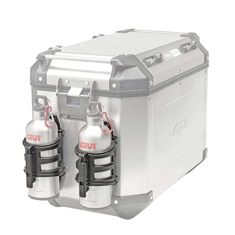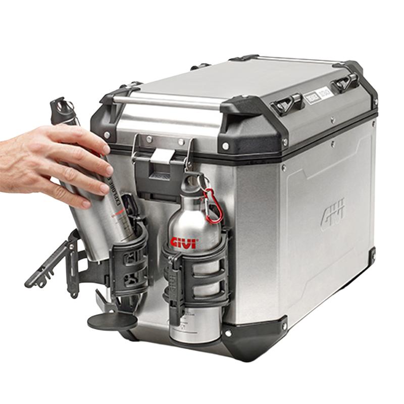 El E199 puede instalarse fácilmente en maletas de aluminio GIVI o en tubos con diámetro entre 21 y 25 mm, ofreciendo una solución práctica para motoristas que necesitan transportar líquidos de forma cómoda y segura durante sus viajes.